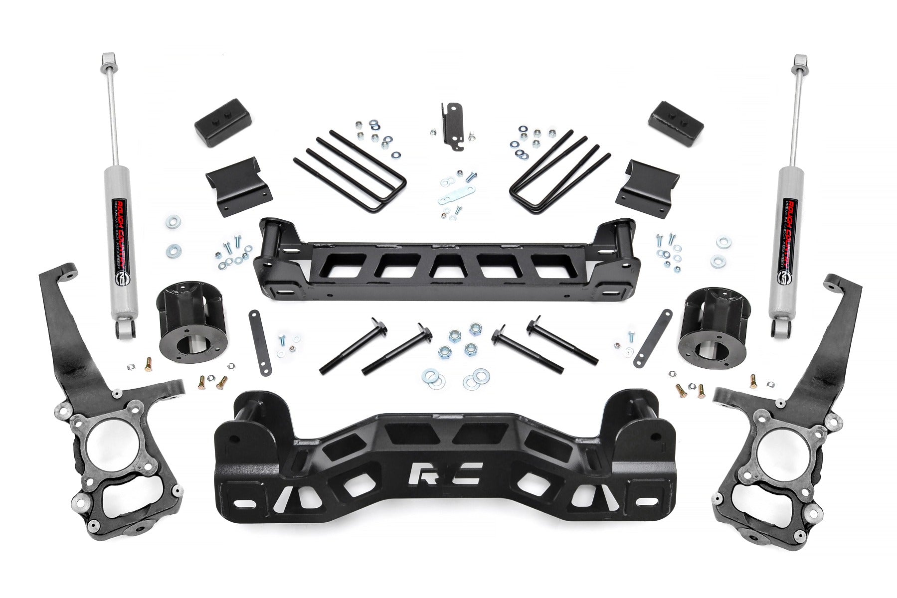 Give your 2WD Ford F-150 an aggressive new look and unparalleled off-road performance with Rough Country's 4-inch Suspension Lift. This all-inclusive kit features everything needed to take your Ford off the freeway and into the fields. Featuring a set of durable lifted knuckles and strut spacers, you'll gain enough ride height to run up to 33-inch tires! A 1/4-inch thick plate steel high clearance front and rear cross member bring uncompromised strength and good looks to your truck, featuring a laser-cut "RC" logo and an easy-to-install design. Our Fabricated Rear Blocks offer considerably more strength than their cast iron counterparts, and were specifically engineered by Rough Country to prevent against axle-wrap. A set of Rough Country's premiere off-road shock absorbers are also included in this kit. No cutting or drilling required to install, and best of all this kit is backed by Rough Country's Lifetime Replacement Warranty!