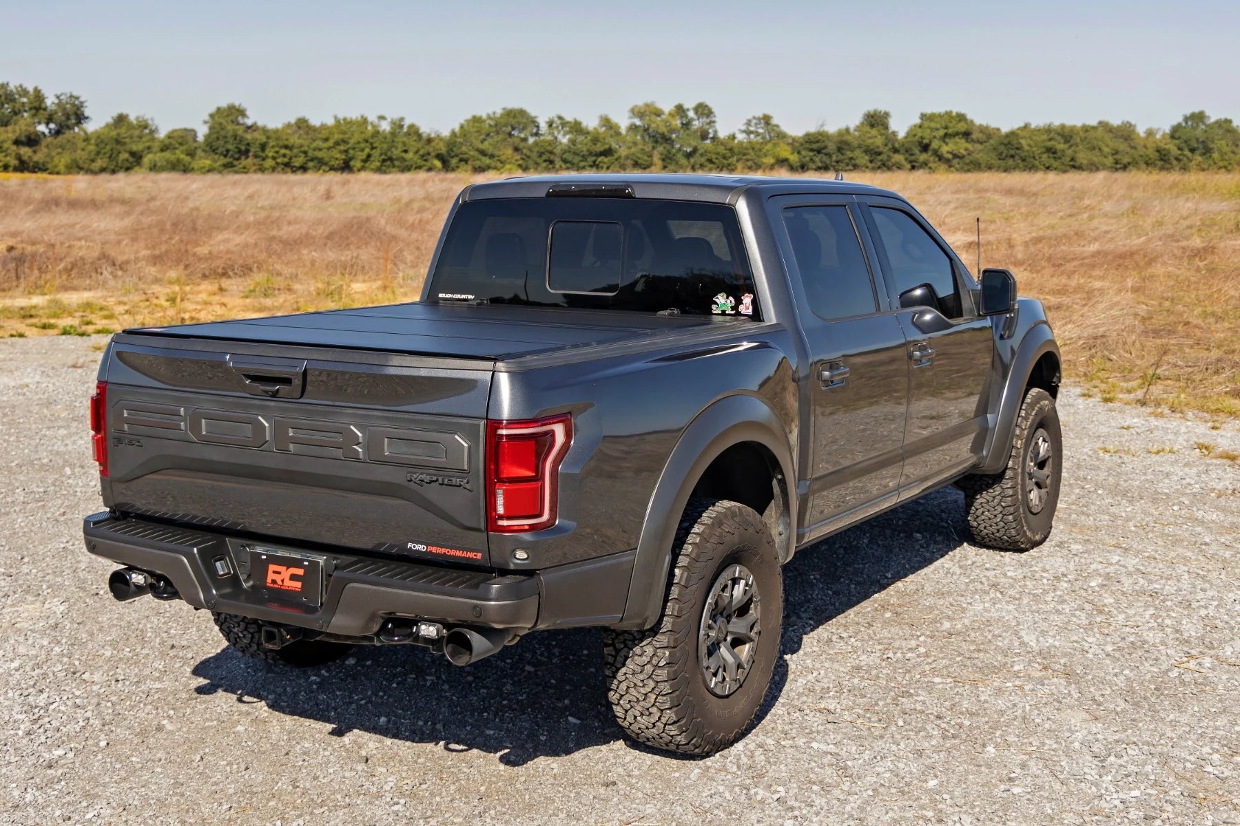 Elevate your F-150’s truck bed and get full access, unmatched durability, and superior weather protection with Rough Country's Hard Tri-fold Flip-up Bed Cover!