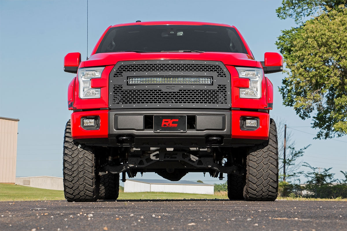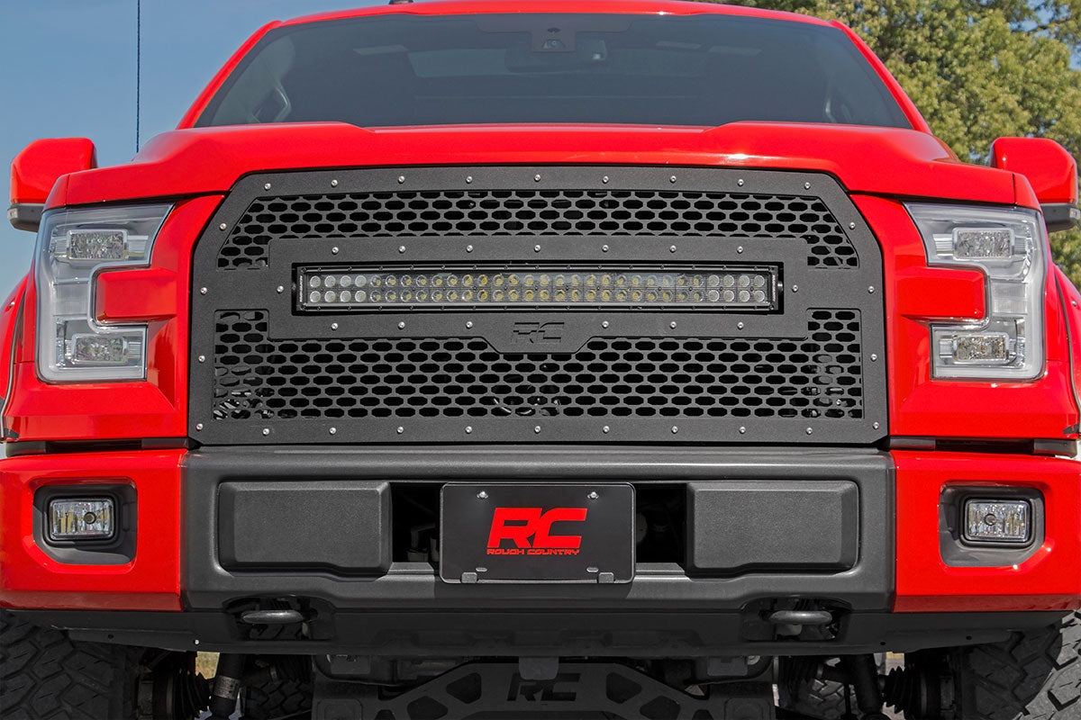 Give the front-end of your Ford F-150 a unique look with Rough Country’s Mesh Grille kit! This easy to install grille replacement kit swaps out your stock grille with the eye-catching, head-turning good looks of this aftermarket upgrade. With a unique, laser-cut mesh pattern surrounded by stylish, stainless steel rivets, this grill gives your truck a more menacing look that’s sure to draw attention.