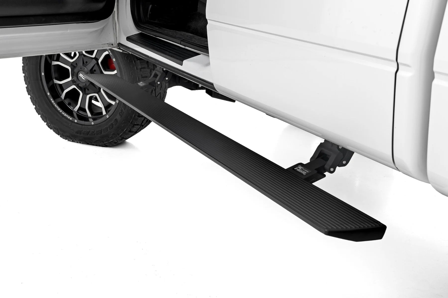 Step up in style. Sidesteps have come a long way, and now we've taken them to the next level with Rough Country's Power Running Boards! These retractable E-Boards tuck tight for a clean look when not in use and automatically extend when the door is opened. With an anti-slip surface that provides a secure stepping area, getting in and out of your ride has never been easier. Our Power Running Boards also include LED lights that provide illumination when deployed and shut off when steps are closed, providing a sleek, aerodynamic look.